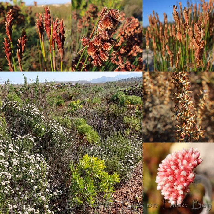 Red Track at Cape Point. 3 from the restio family with Staberoha tassel reed in the middle. 3 daisies white Metalasia densa wafts honey along the path. Spike of Seriphium cinereum. Strawberry buds for white Anaxeton laeve.